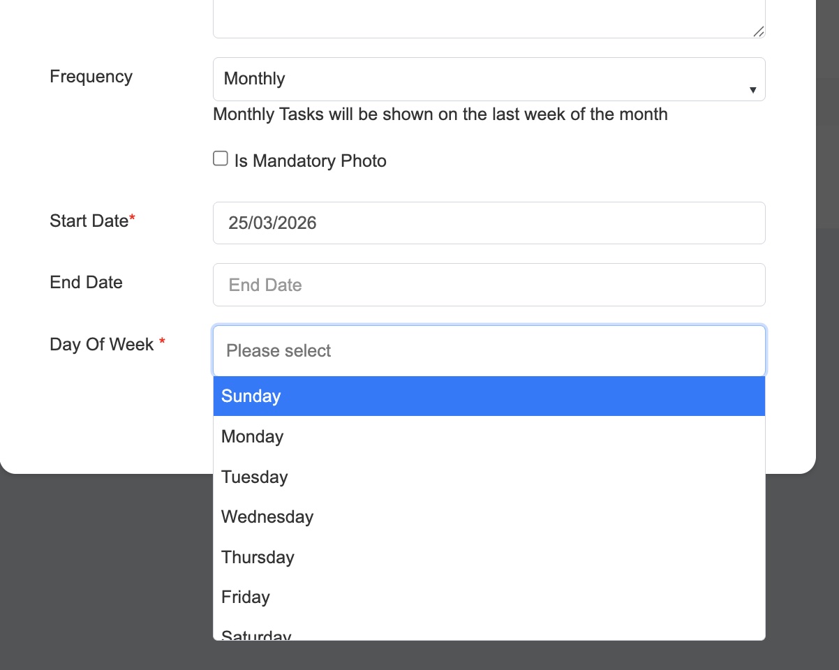 1. If the frequency is “Monthly”, the task will appear in the last week of the month on the selected day of the week.