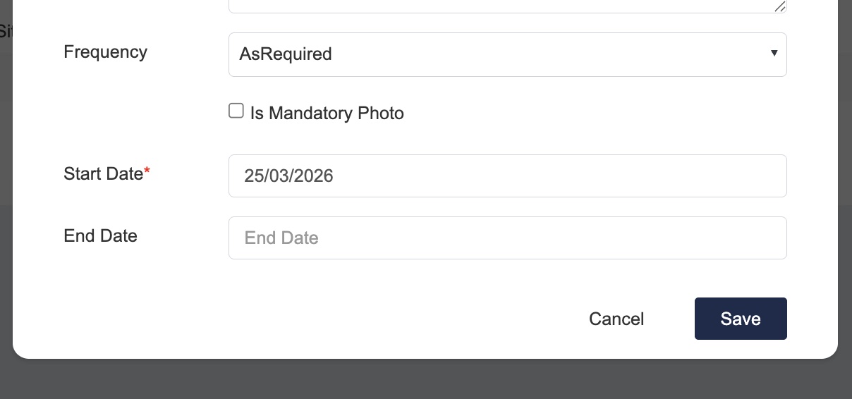 1. Frequency determines when the checklist item is shown. The start and end dates define the time period during which the checklist item will be available.