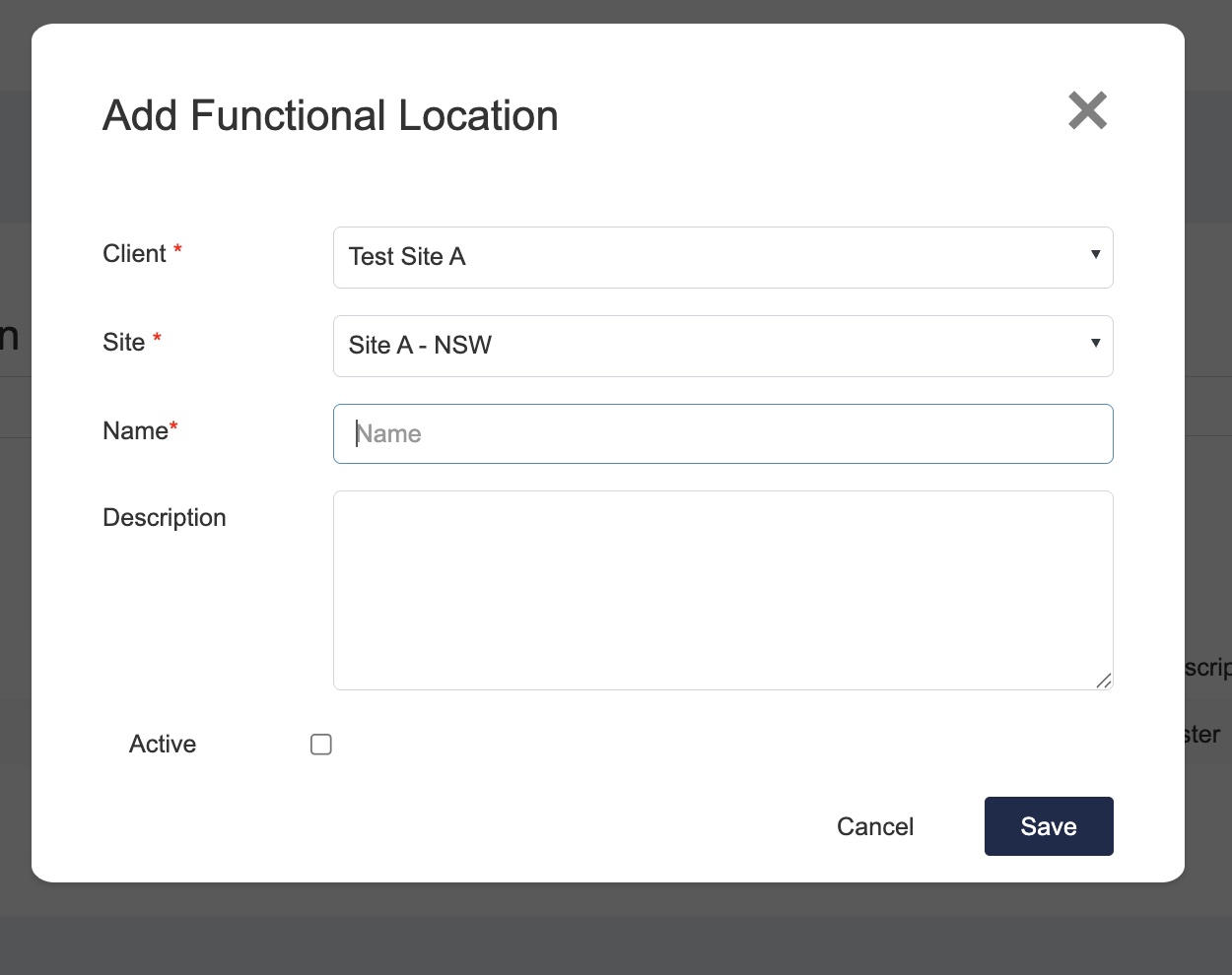 2. Enter Client/Site and Location name. Make it active so that it can show in the “Area” list.