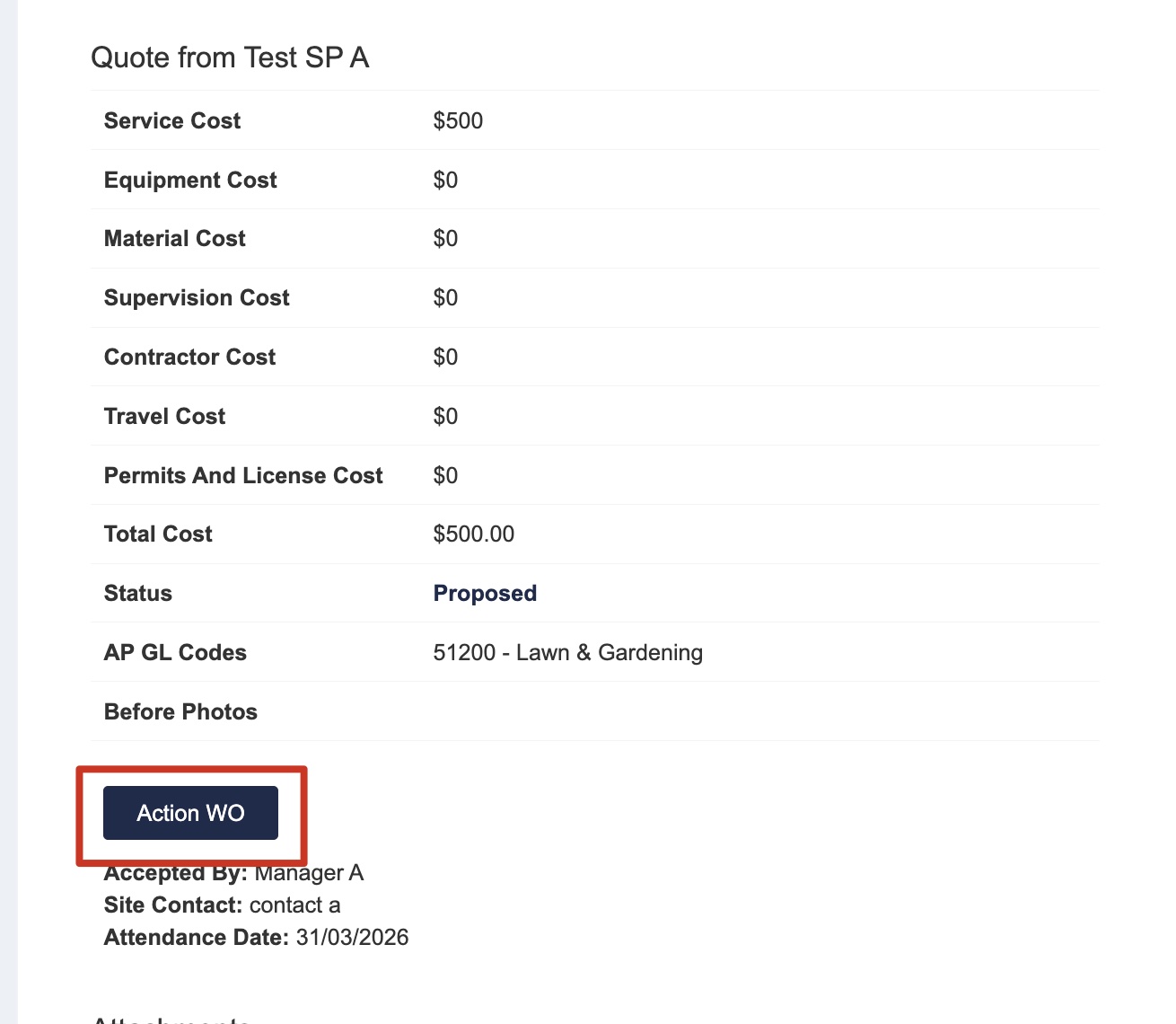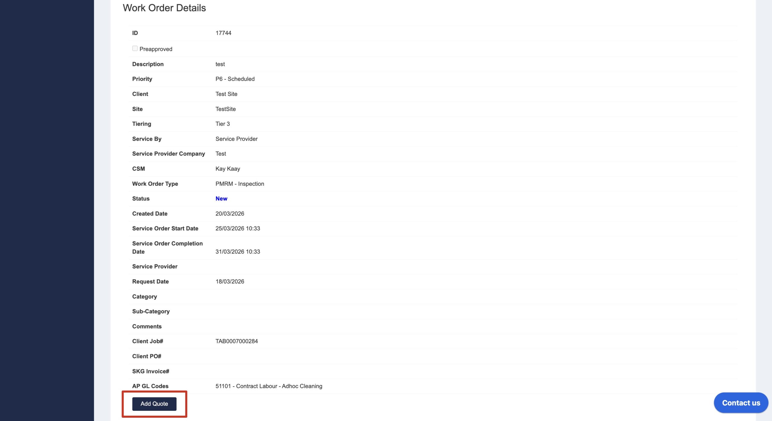 2. Click “Provide Quote” to open the WO details page or login to the SP portal then > Work Orders to check the WOs waiting for action.