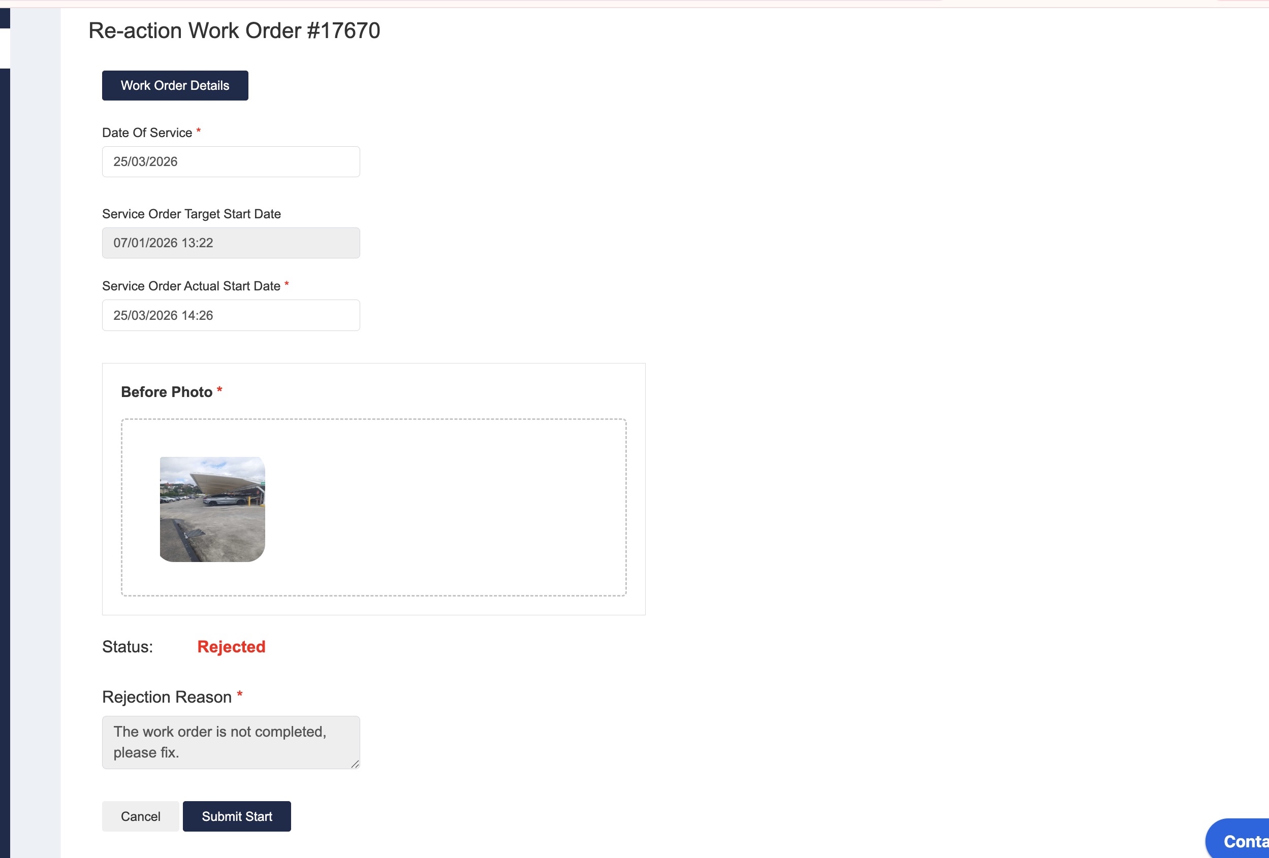If the work order completion is rejected, then you need to resubmit the completion evidence.